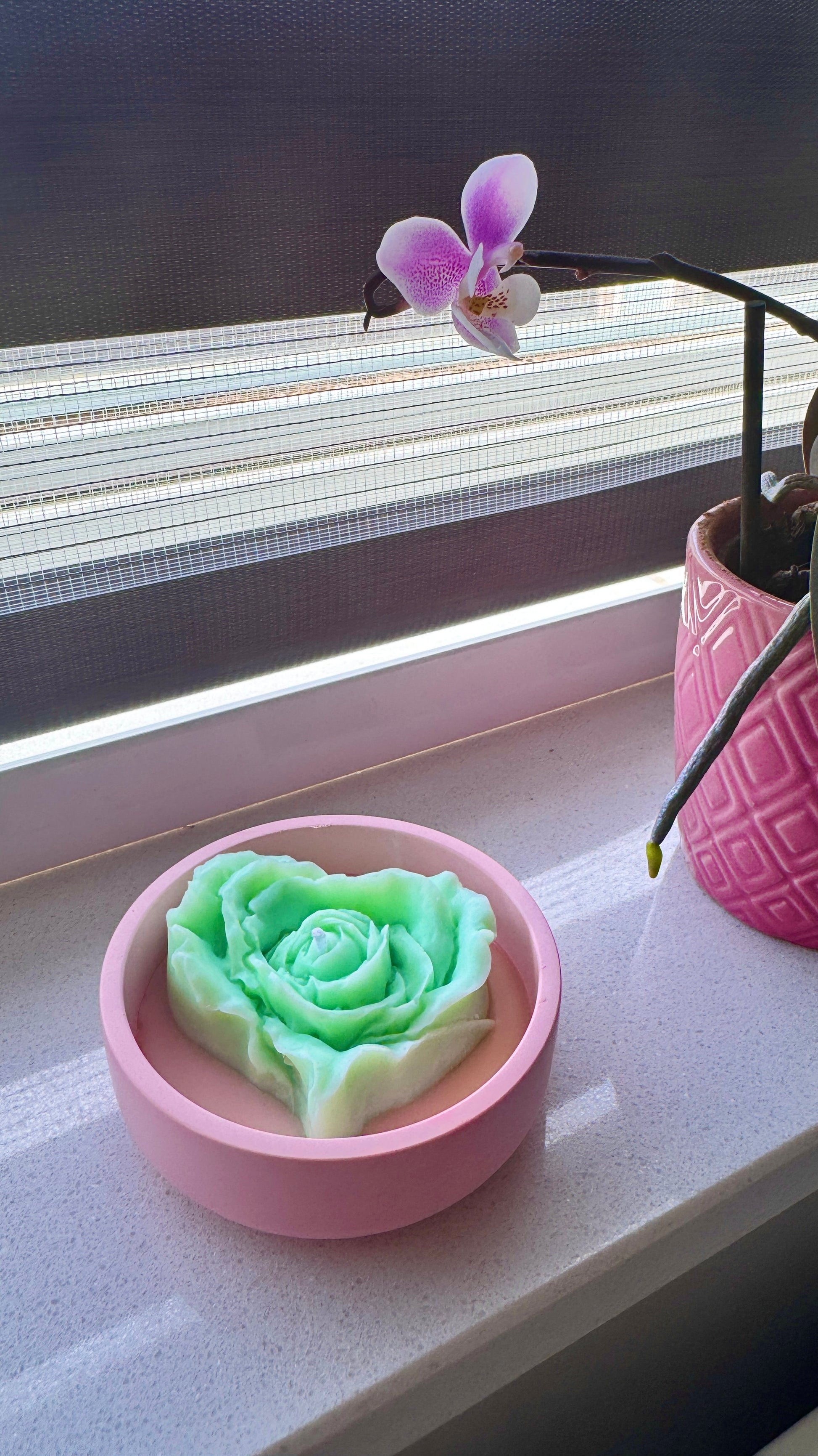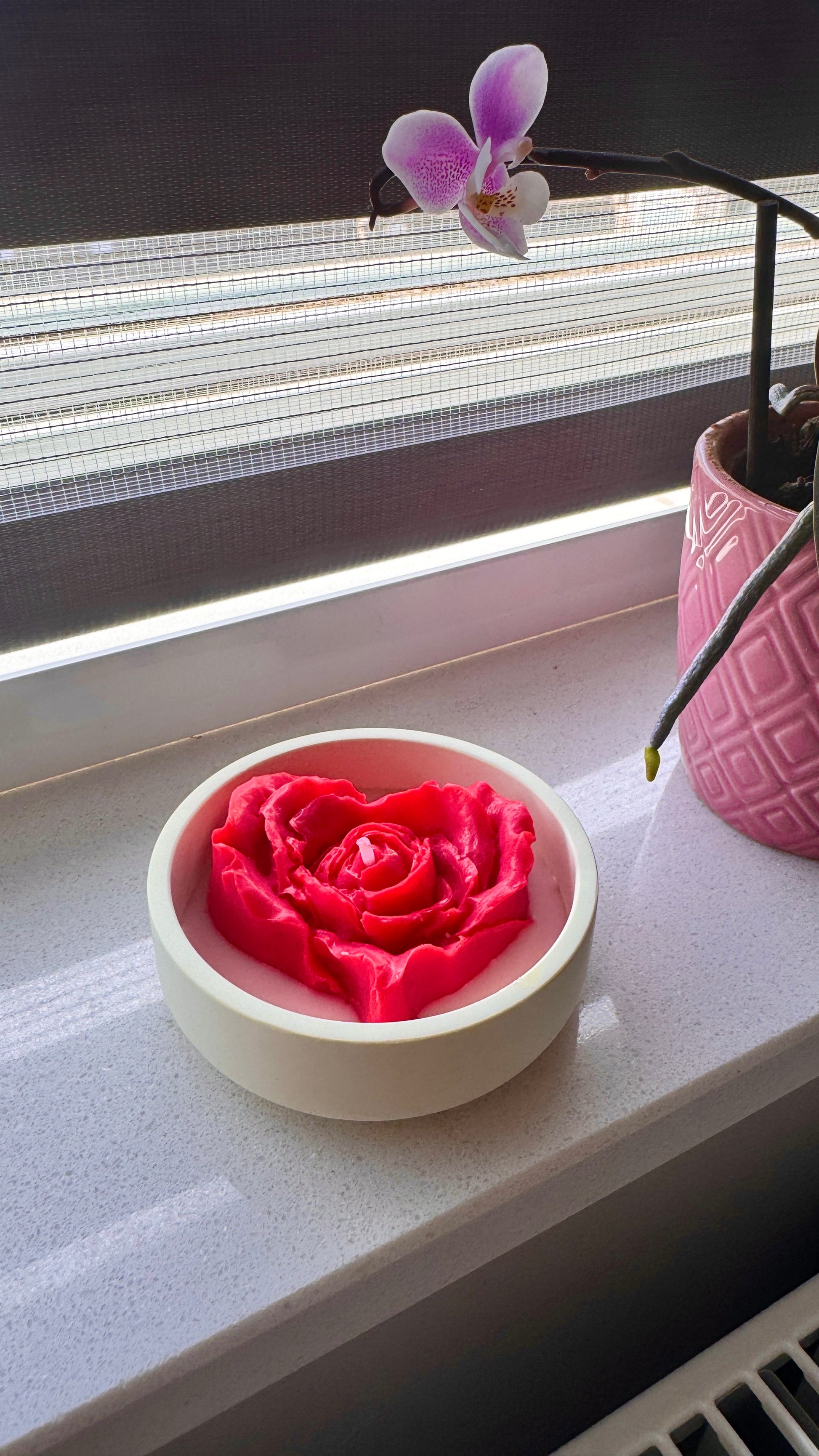 Laat liefde en kracht samensmelten Hartbloei. Een hand gegoten kaars in de vorm van een volledig geopende roos. Met haar levendige, diepe roze kleur en robuuste bloemblaadjes, rust ze in een zachte, ronde schaal met pastelroze bodem. Deze kaars straalt vrouwelijkheid, elegantie en karakter uit.